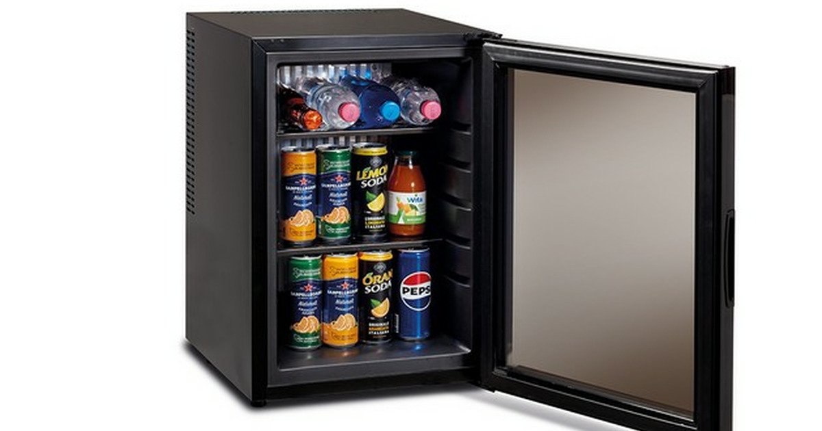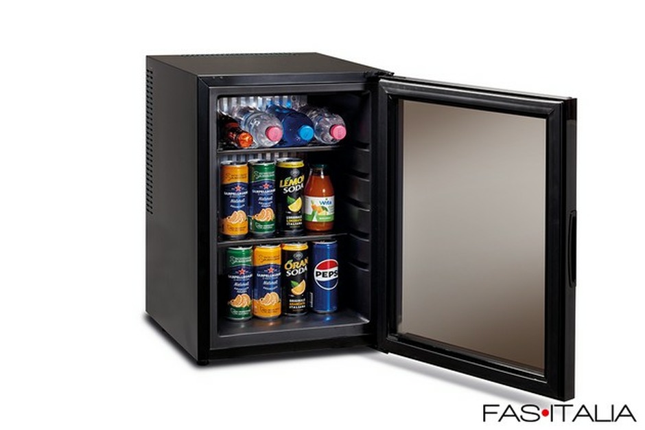 Frigobar totalmente silezionso. Dotato di termostato elettronico. Con porta in vetro fumé. Caratteristiche: